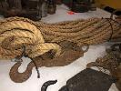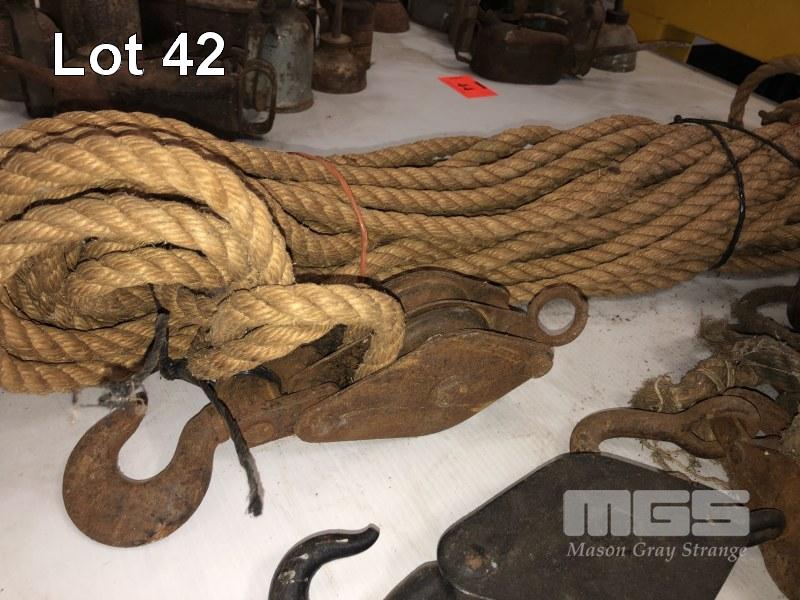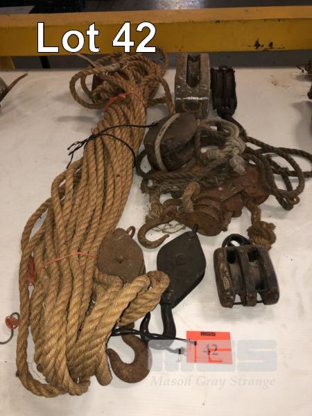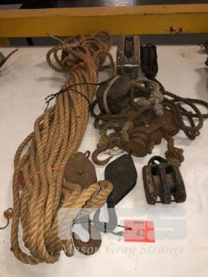 OLD SHEAVE BLOCKS, STEEL & TIMBER, (7 x ITEMS), PLUS ROPE WITH 2 x DOUBLE ROW BLOCKS & HOOK