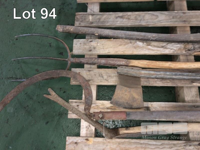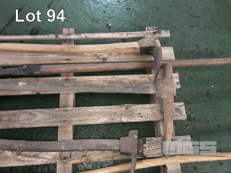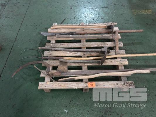 EARLY GARDEN IMPLEMENTS, PICKS, FORK HAND CUTTER. , ETC, 1 x PALLET