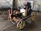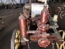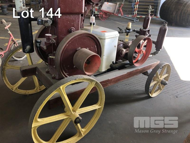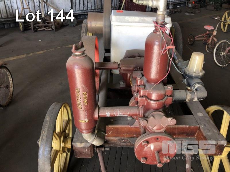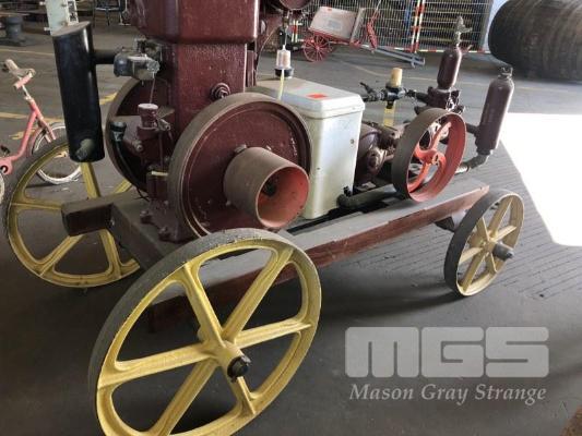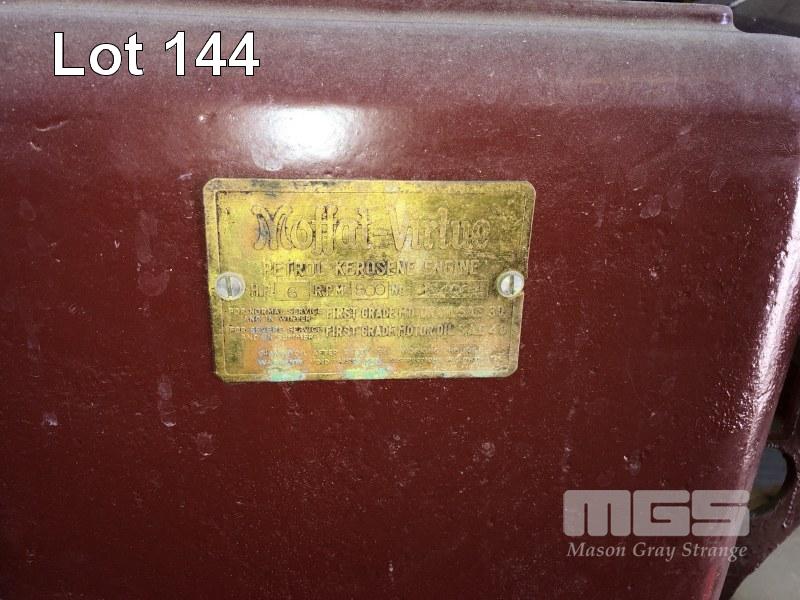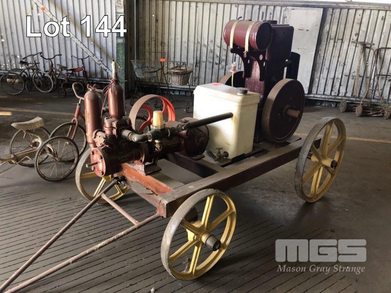 MOFFAT VIRTUE 6HP PETROL/KERO ENGINE FLAT BELT DRIVE TO SOUTHERN CROSS PUMP, ON CARRIAGE, TIMBER FRAME WITH CAST WHEELS