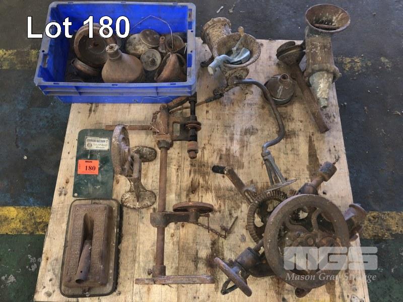 ASSORTED COLLECTABLES, 2 x OLD POST MOUNT DRILLS, & FOOD PROCESSORS, FWD/REVERS LEVER 1 x PALLET