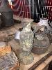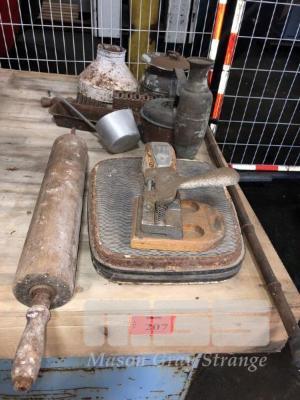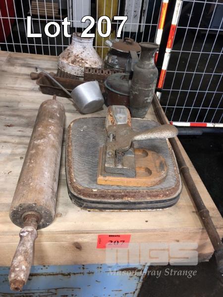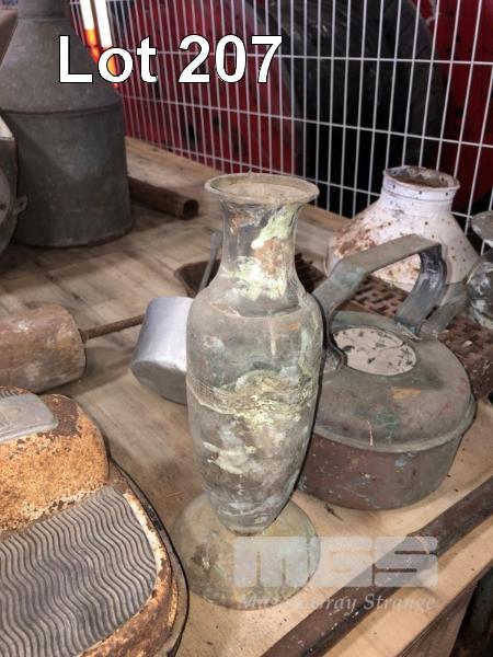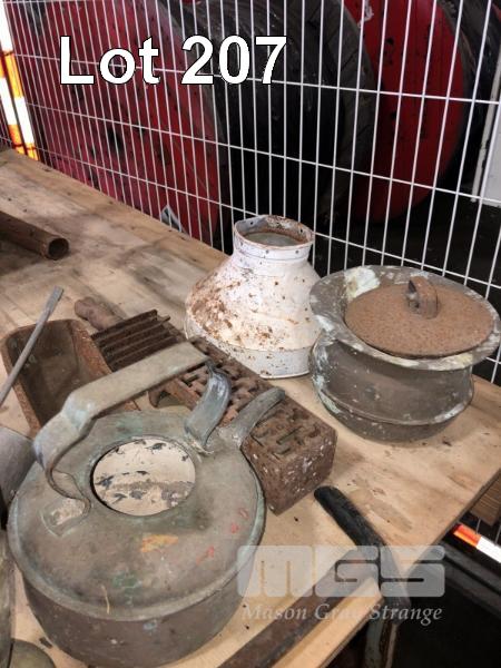 BRASS POT, KETTLE & URN, VINTAGE BATHROOM SCALES, WALKING STICK & DOE ROLL