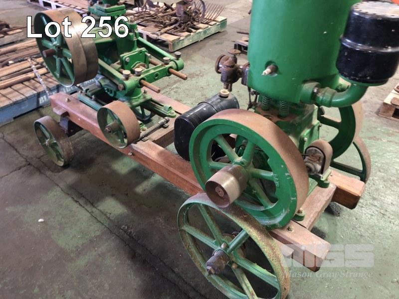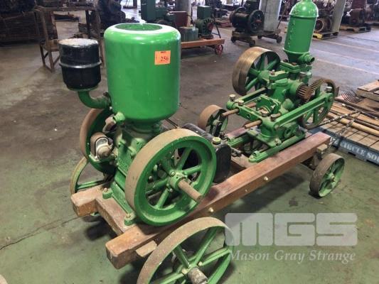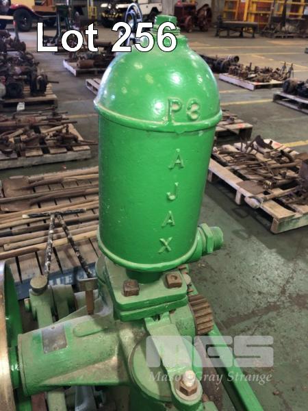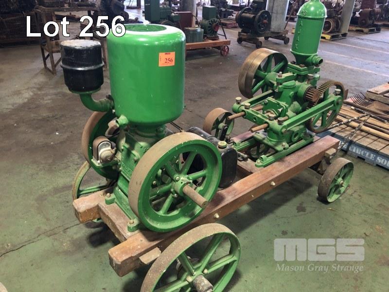 LISTER A344 PETROL SINGLE CYLINDER ENGINE FLAT BELT DRIVE CIRCA 1930. WITH AJAX P3 PUMP ON TIMBER FRAME TROLLEY WITH CAST IRON WHEELS