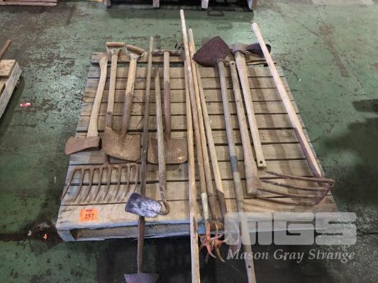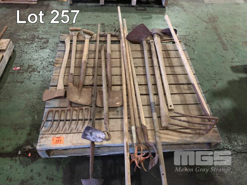 14 x EARLY GARDEN HAND TOOLS, RAKES, SPADES, FORKS, PICKS, AXE