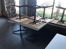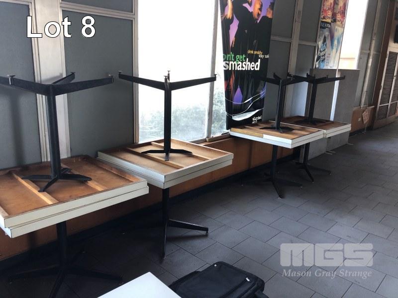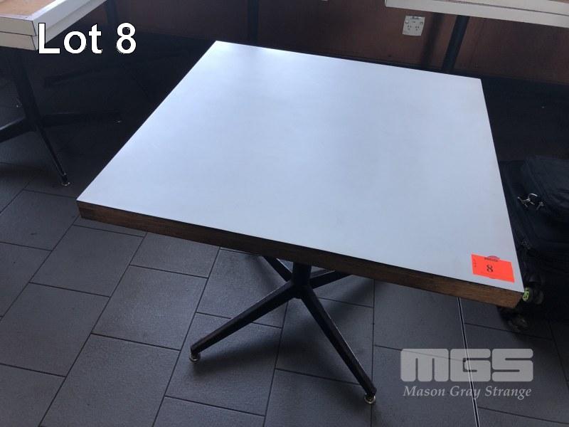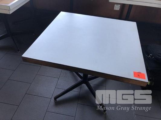 20 x CAFE TABLES, 900 x 900mm APPROX, WHITE LAMINATE, STEEL PEDESTAL BASE
