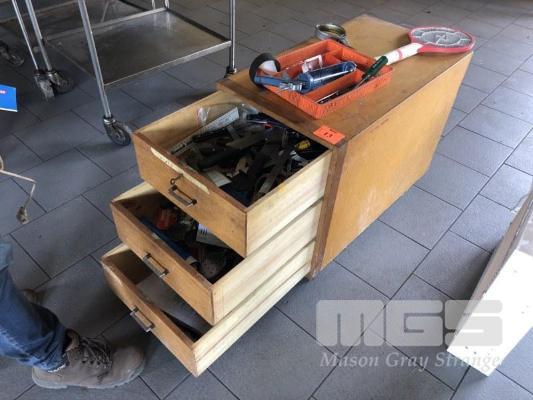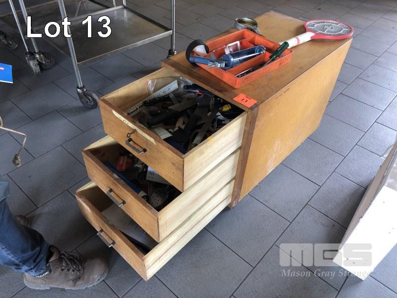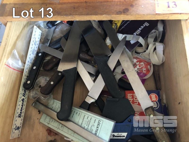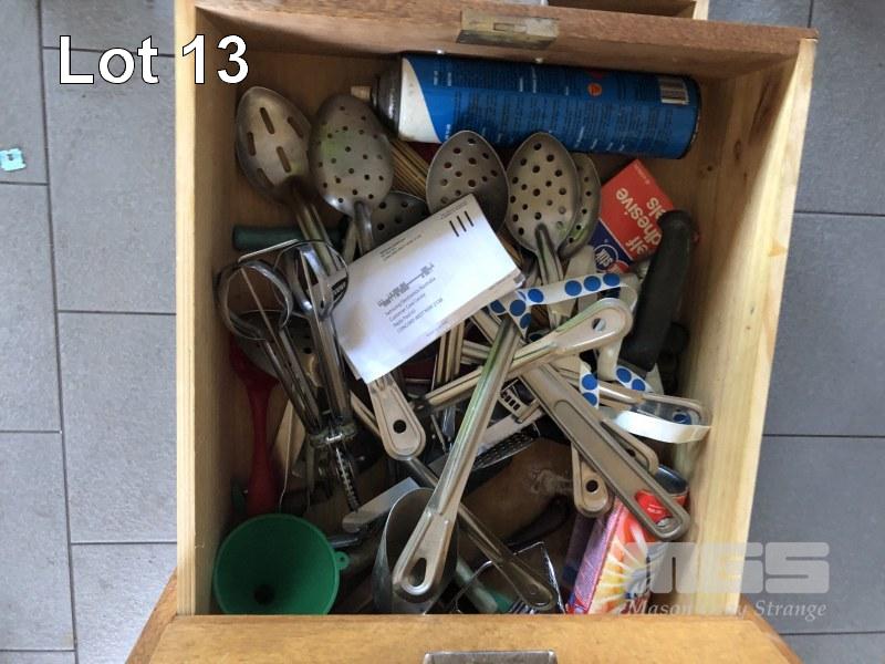 TIMBER DRAWER UNIT, COOKING UTENSILS INCLUDING LADLES, KNIVES, SPOONS, ETC