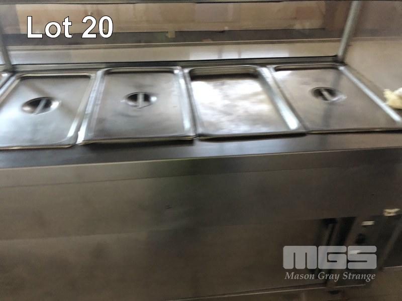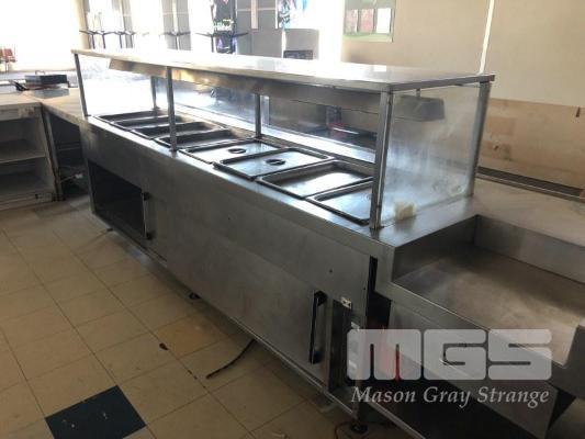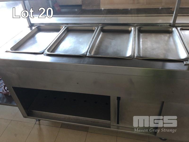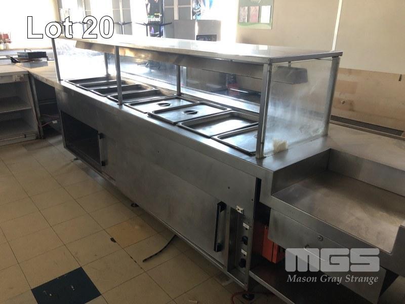 STAINLESS STEEL SERVERY INCLUDING WET BASE BAIN MARIE DISPLAY WITH WARMING & CASH REGISTER CUT OUT, 5300mm (L), 1200mm (W)