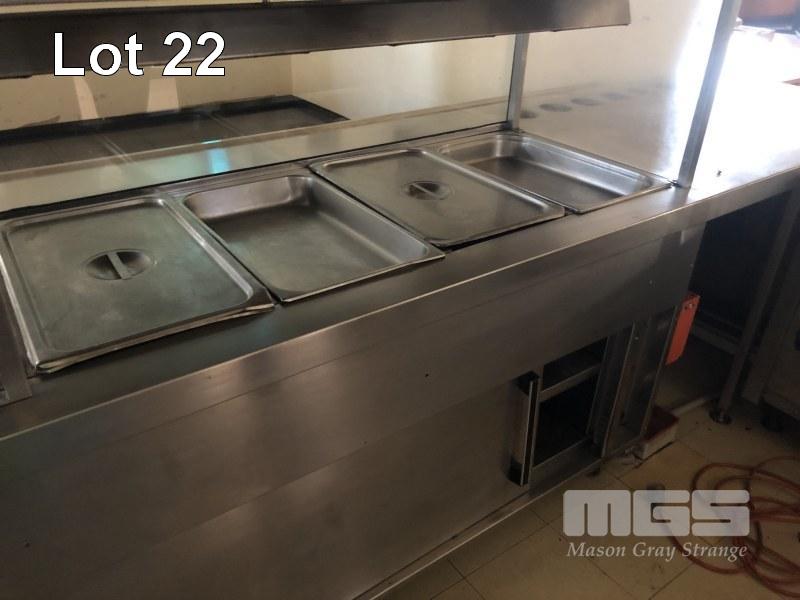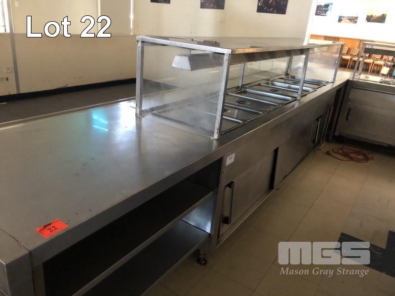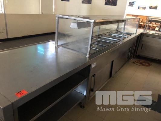 STAINLESS STEEL SERVERY INCLUDING WET BASE BAIN MARIE DISPLAY WITH WARMING, 5200mm (L), 1200mm (W)