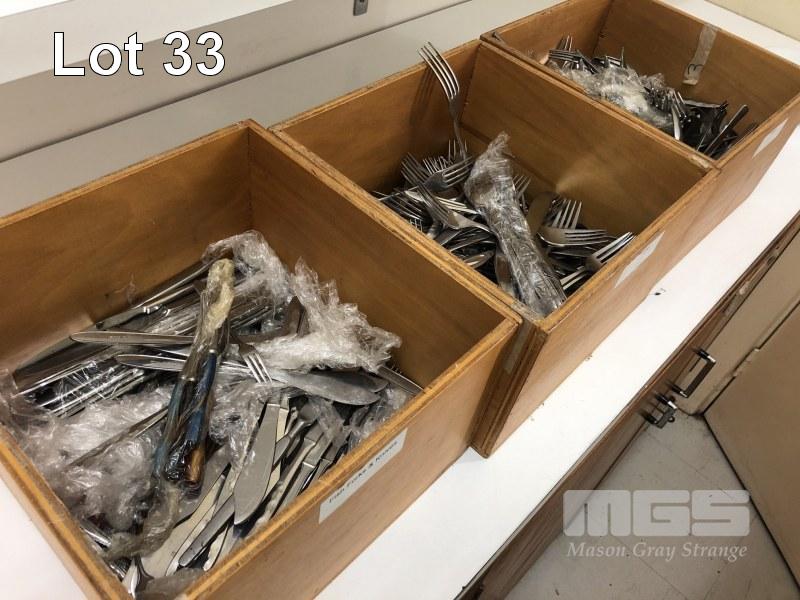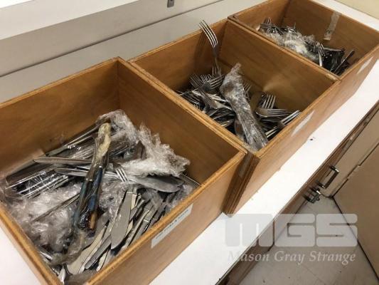 HUGE QUANTITY KNIVES, FORKS, SPOONS, SERVING DISHES, ETC