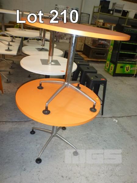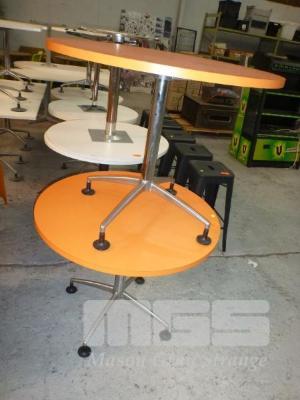 2 x ROUND TABLES, ORANGE TIMBER LAMINATE, 900mm DIAMETER, CHROME STEEL PEDESTAL BASE