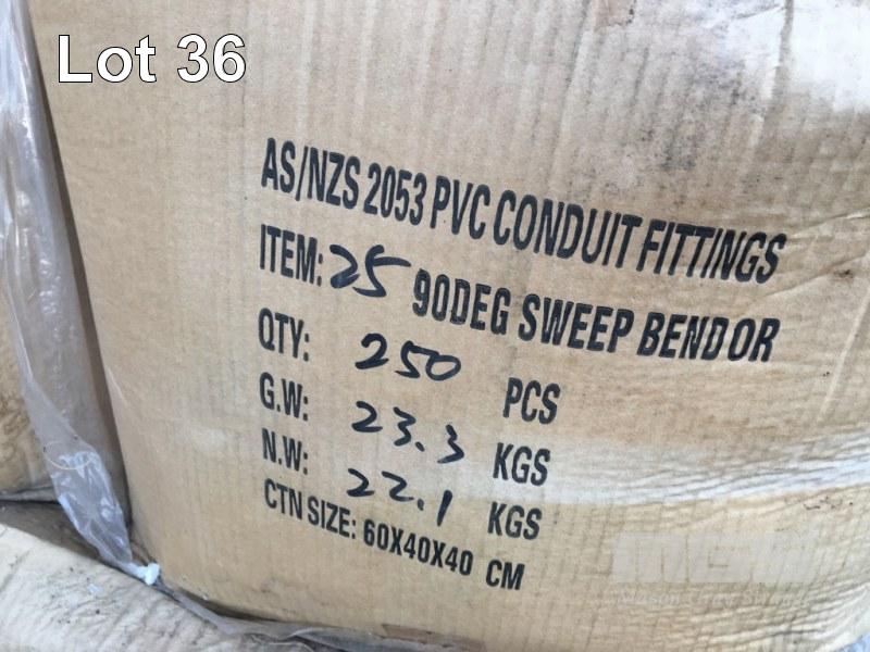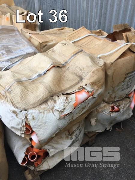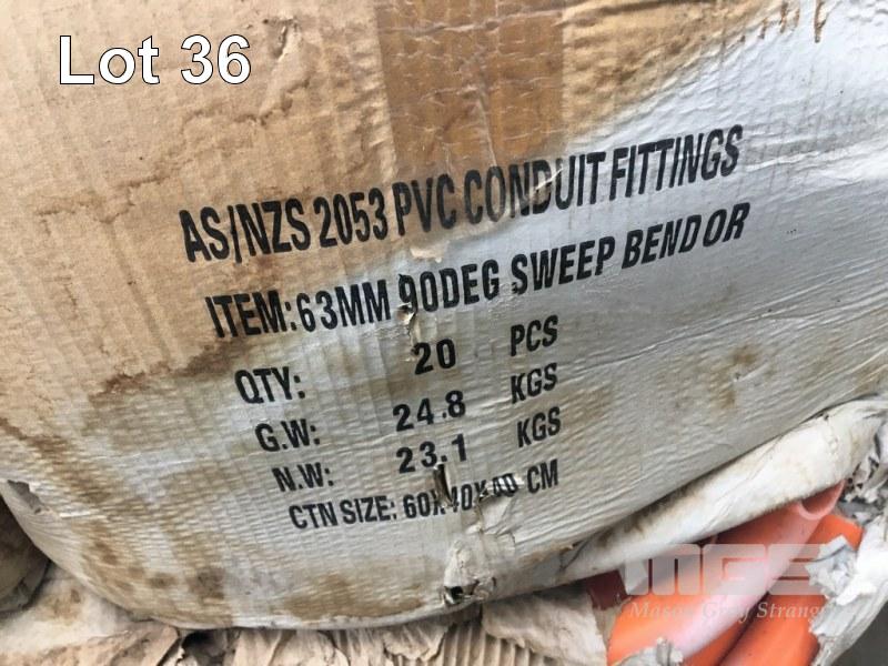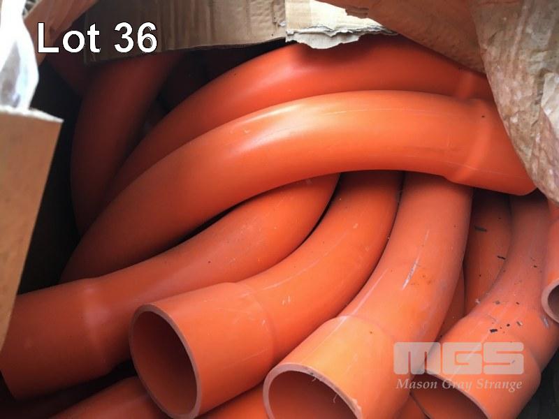 PVC CONDUIT FITTINGS, ORANGE, 90 DEGREES, SWEEPING BENDS, SIZES INCLUDE 60 x 63mm, (3 x BOXES) 32 x 50mm, (1 x BOX), 240 x 40mm, (2 x BOXES), 120 x 32mm (1 x BOX) & 250 x 25mm, (1 x BOX) 1 x PALLET