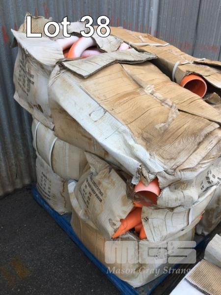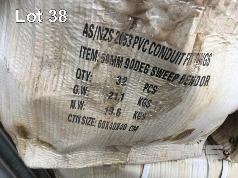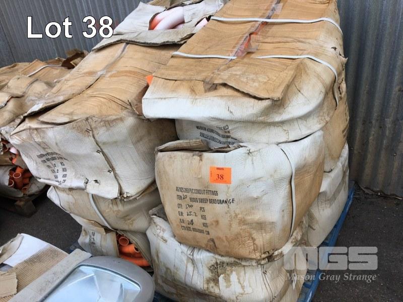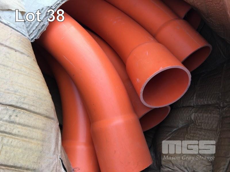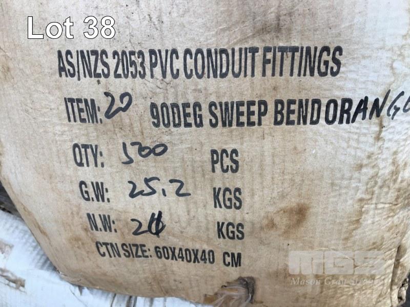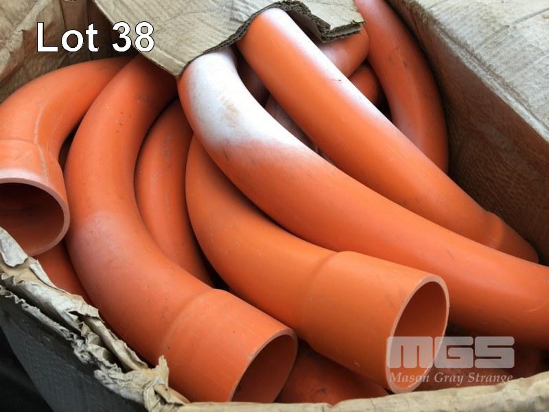 PVC CONDUIT FITTINGS, ORANGE, 90 DEGREES, SWEEPING BENDS, SIZES INCLUDE 6 x 100mm, (1 x BOX) 12 x 80mm, (1 x BOX), 20 x 63mm, (1 x BOX) & 64 x 50mm (2 x BOXES), 240 x 40mm (4 x BOXES), 120 x 32mm (1 x BOX) & 500 x 20mm (1 x BOX) 1 x PALLET