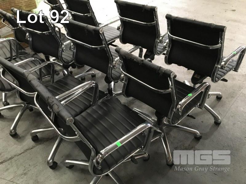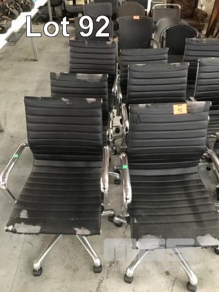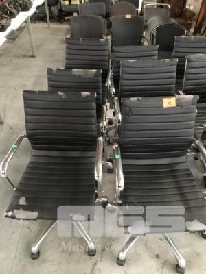 8 x OFFICE CHAIRS,CHROME STEEL FRAME WITH BLACK CLOTH TRIM, GAS LIFT, MOBILE (DAMAGED TRIM)