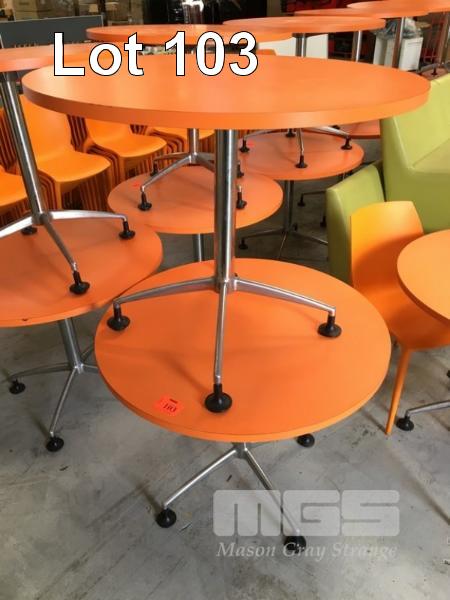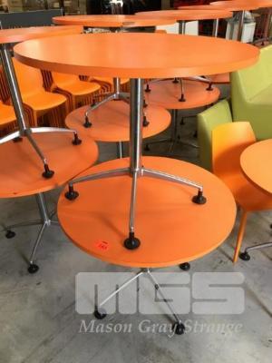 2 x ROUND TABLES, ORANGE TIMBER LAMINATE, 900mm DIAMETER, CHROME STEEL PEDESTAL BASE