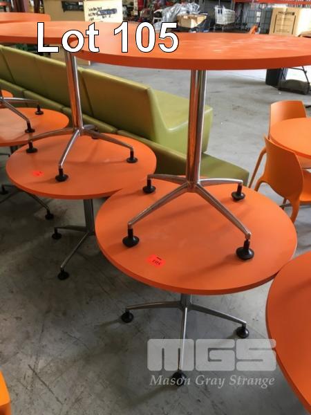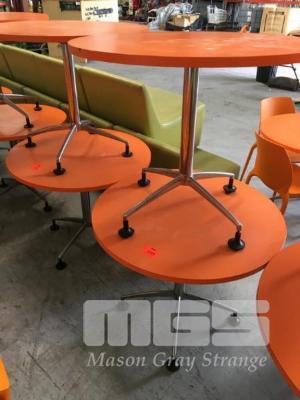 2 x ROUND TABLES, ORANGE TIMBER LAMINATE, 900mm DIAMETER, CHROME STEEL PEDESTAL BASE