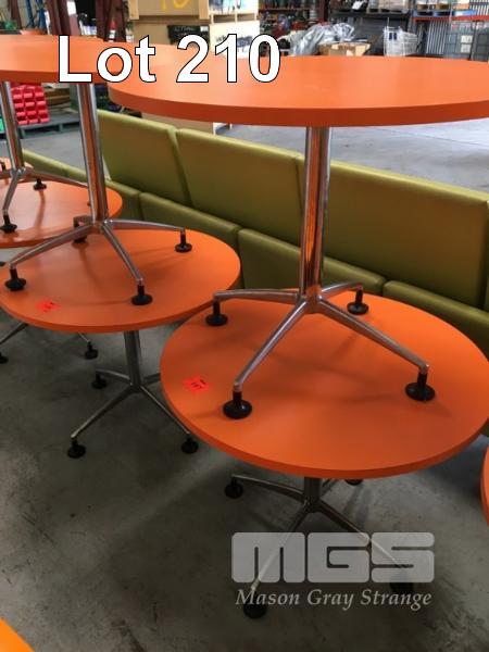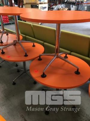 2 x ROUND TABLES, ORANGE TIMBER LAMINATE, 900mm DIAMETER, CHROME STEEL PEDESTAL BASE
