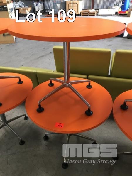 2 x ROUND TABLES, ORANGE TIMBER LAMINATE, 900mm DIAMETER, CHROME STEEL PEDESTAL BASE