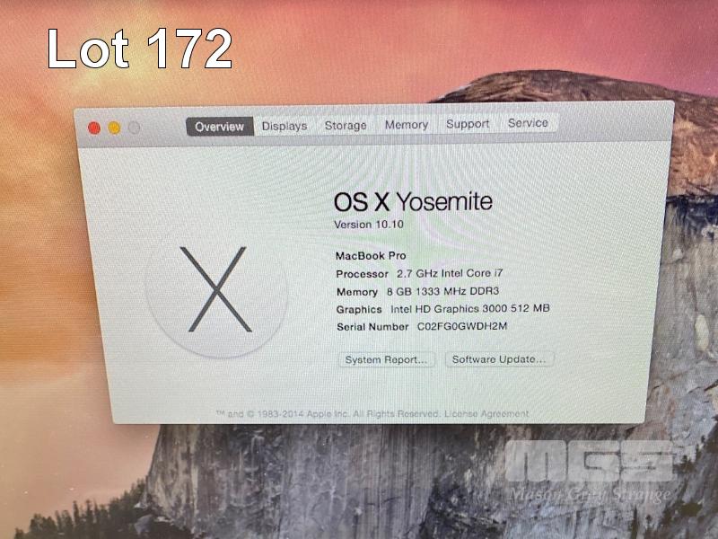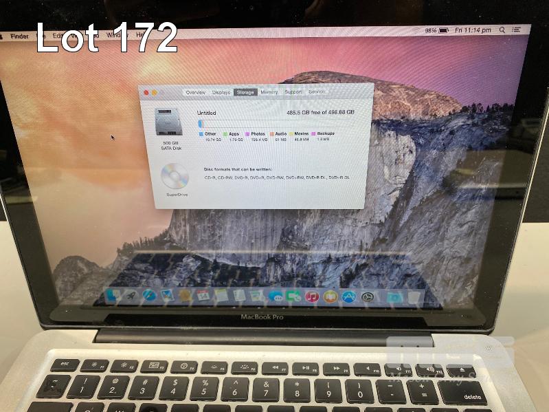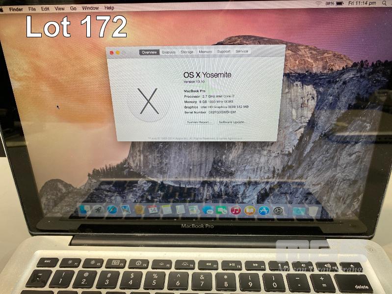 LAPTOP, APPLE MACBOOK PRO (A1278), CORE i7 2620M (2ND GEN) @ 2.7GHz, 8GB DDR3 RAM, 500GB SATA HDD, DVD-RW, 13.3" WIDESCREEN (1280x800), INTEL HD VIDEO, Wi-Fi, MAC OS 10.10 INSTALLED & POWER SUPPLY (NOTE: DAMAGE TO CASING NEAR SCREEN HINGE) S/N:C02FG0GWDH2M