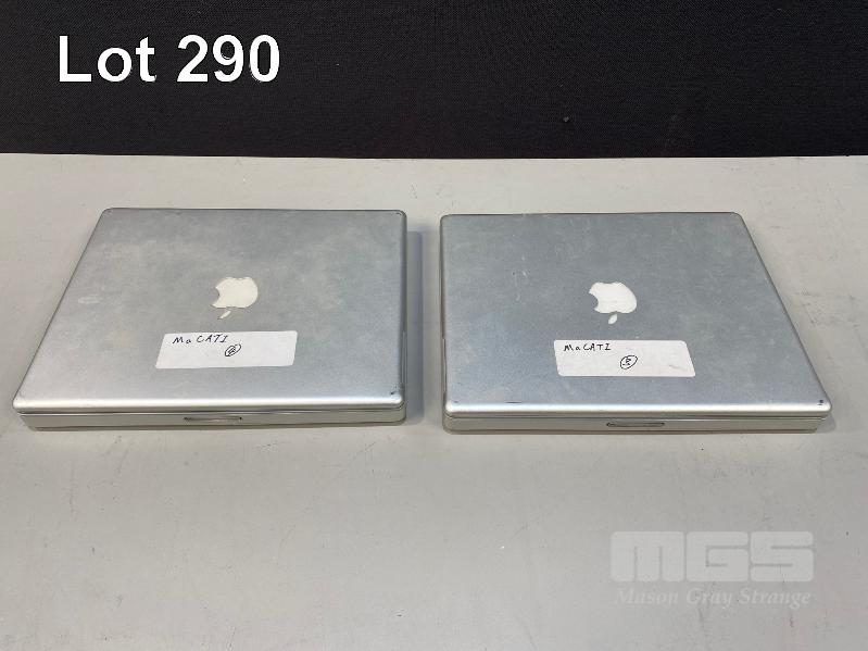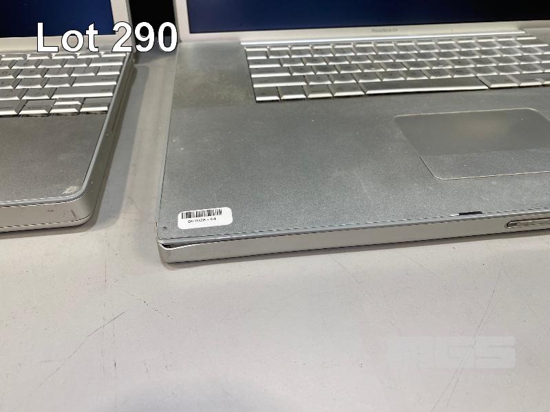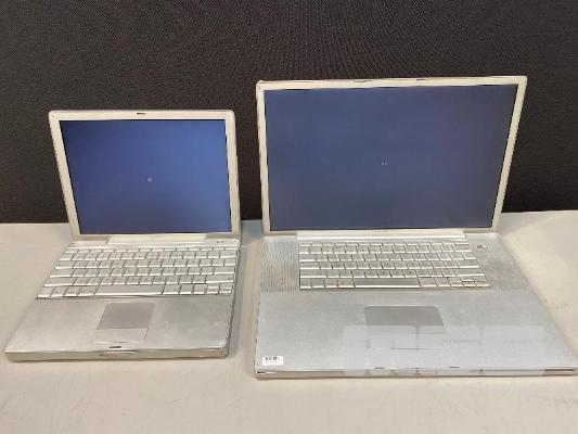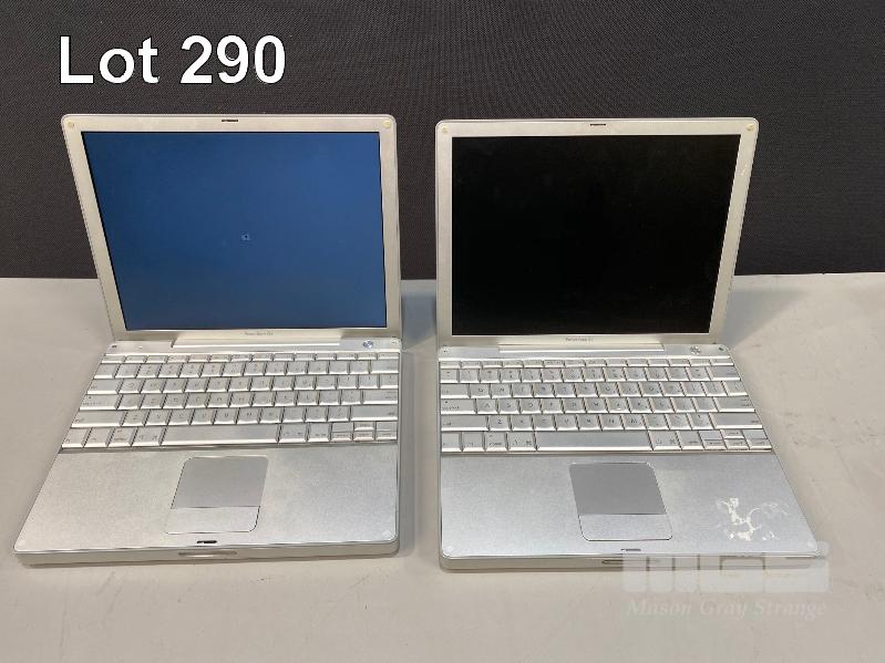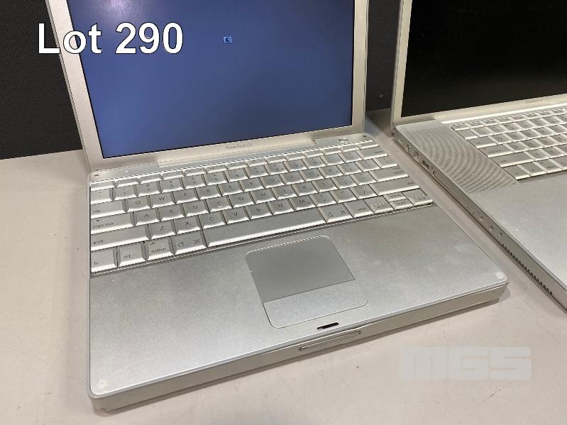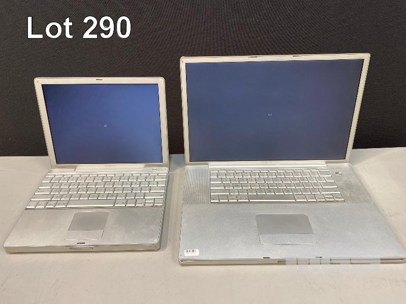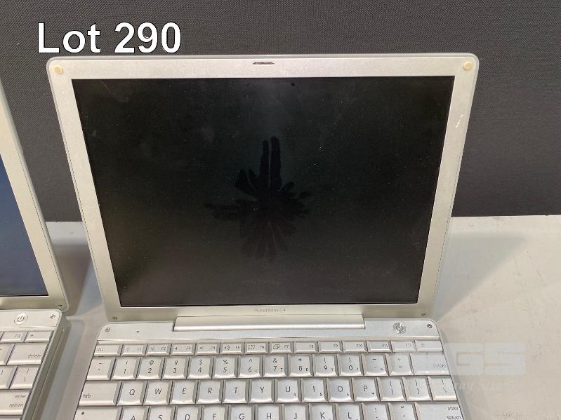 4 x APPLE LAPTOPS INC. APPLE POWERBOOK G4, 17", 1.33GHz, 1GB RAM, 80GB HDD APPLE POWERBOOK G4, 12", 867MHz, 128MB RAM, 60GB HDD APPLE POWERBOOK G4, 12", 1GHz, 768MB RAM, 40GB HDD (DAMAGED SCREEN) APPLE POWERBOOK G4, 12", 1.33GHz, 1.25GB RAM, 250GB HDD (DAMAGED POWER INPUT) (WITH POWER SUPPLIES) (NOTE: ALL VARIOUS DAMAGE TO CASING) S/N:V73478Q2P22, UV3051C3MRT, UV42902XPLW, N/A
