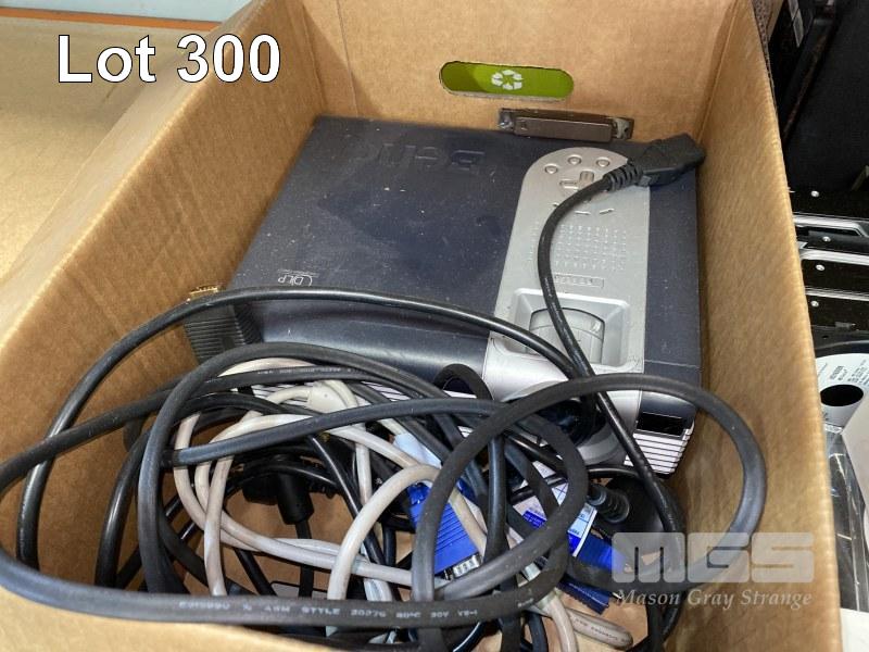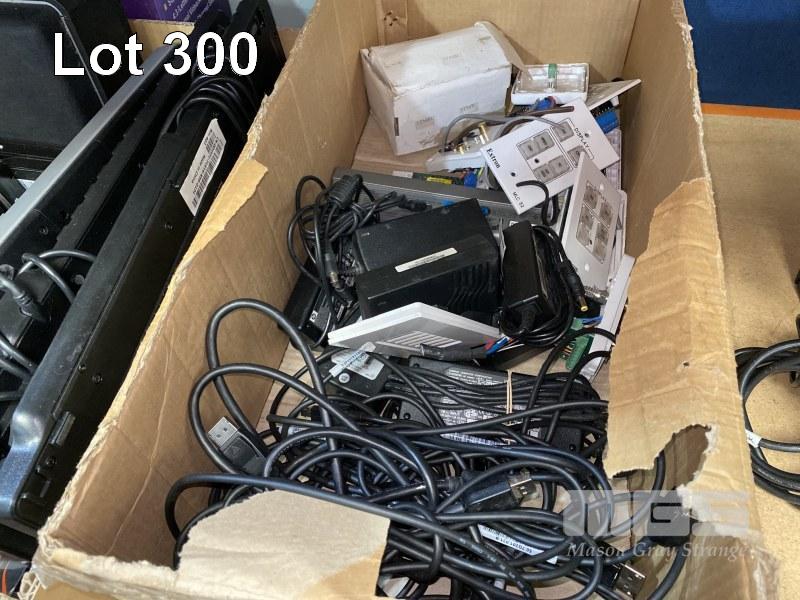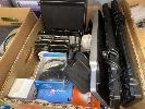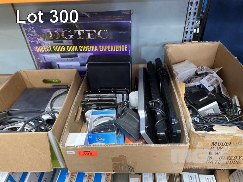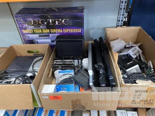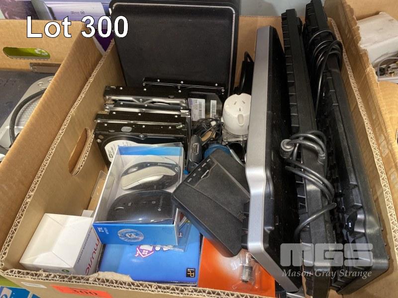 3 x BOXES ASST IT SUNDRIES INC. PROJECTOR, HARD DRIVES, KEYBOARDS, POWER SUPPLIES, LAPTOP BATTERIES, SET-TOP BOX ETC
