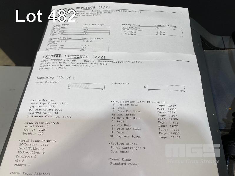 PRINTER, BROTHER MFC-L2703DW MFC LASER, 12,177 PAGES (TEST PAGE ATTACHED) (NOTE: MESSAGE "REPLACE DRUM")