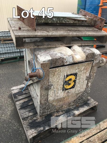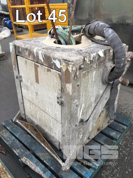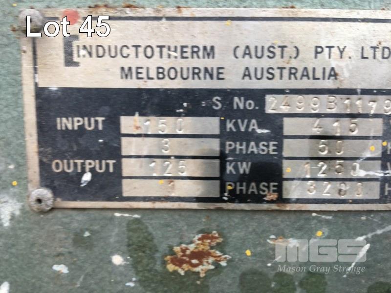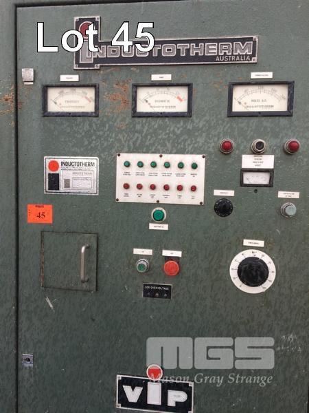 2 x SMALL INDUCTION CRUCIBLES TILTING, 260kg WITH INDUCTOTHERM SUPPLY CONTROL CABINET INPUT 150KVA, 3 PHASE, 50HZ OUTPUT 125KVA, 1 PHASE, 250V, 3200HZ