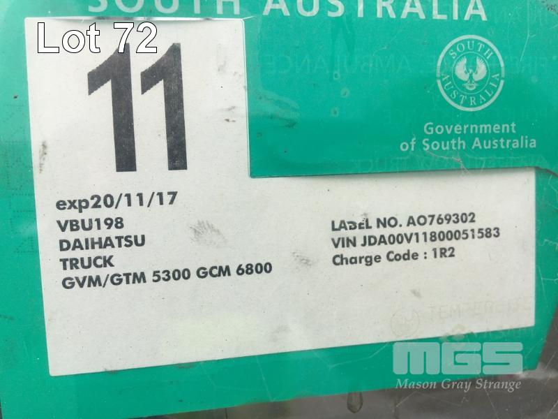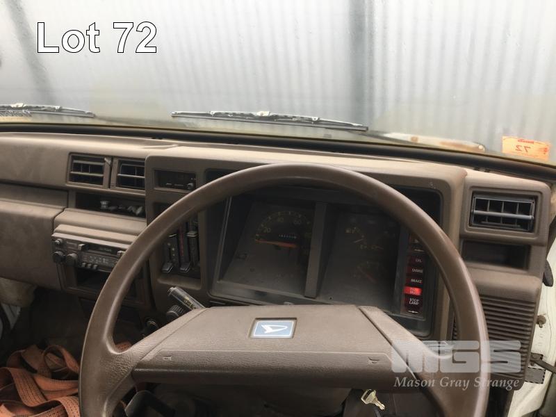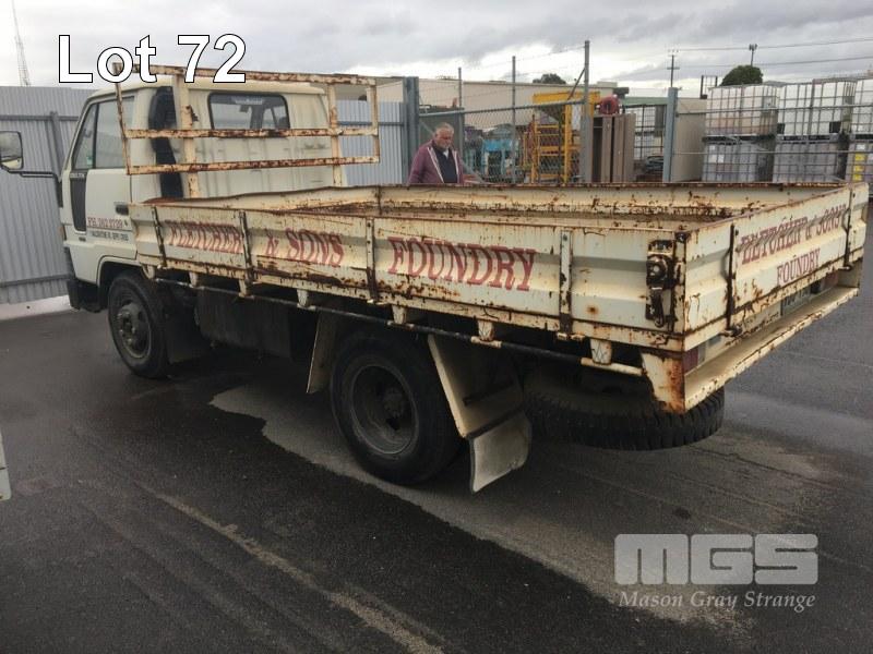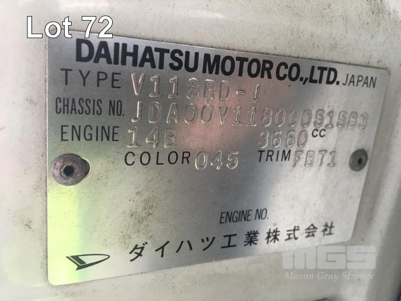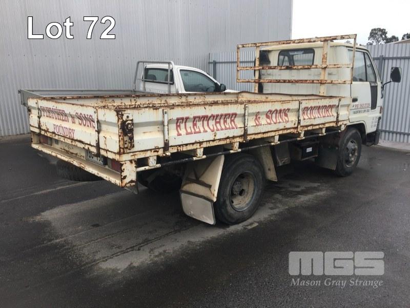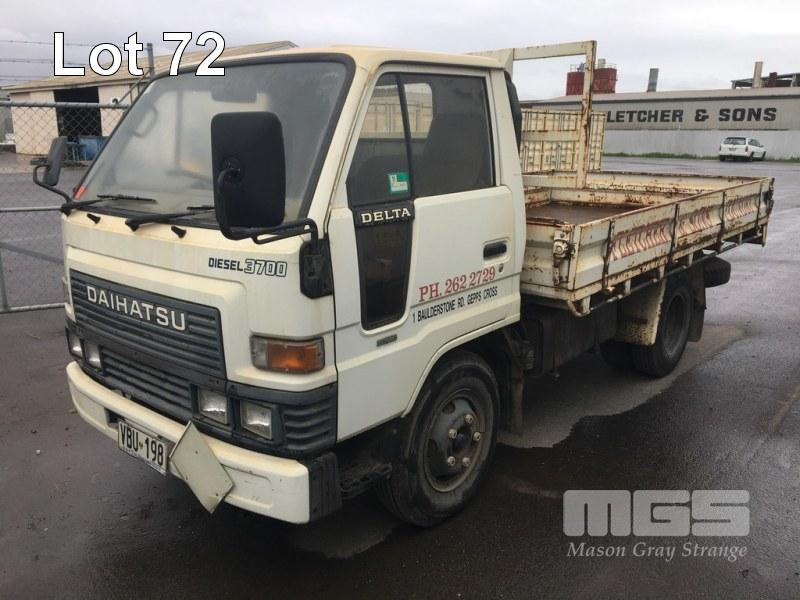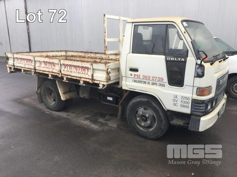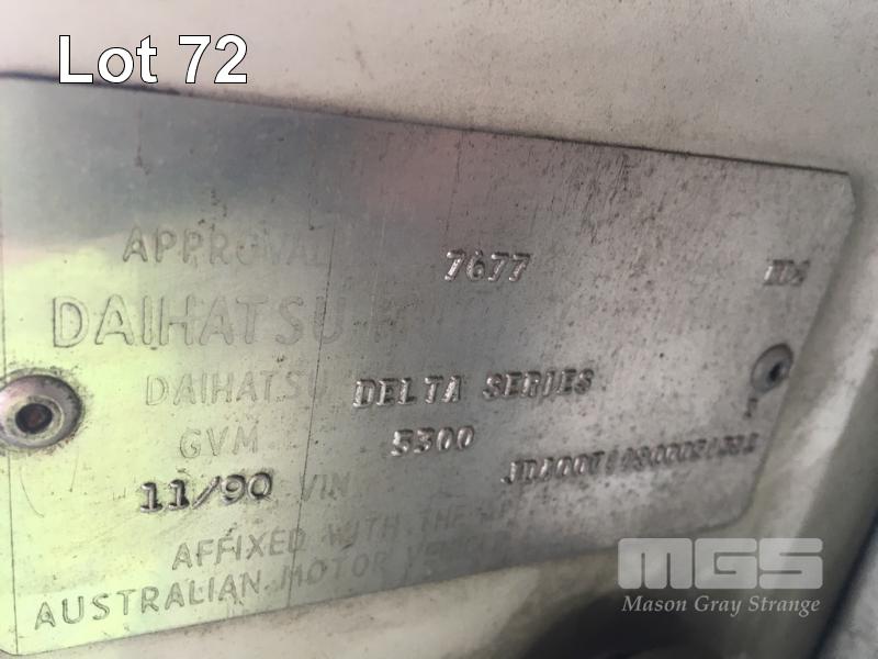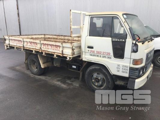 1990 DAIHATSU DELTA SERIES TRAY TOP TRUCK REG: VBU 198 VIN: JDA00V11800051583 ODO: 103,466kms SHOWING GVM: 5,300kg GCM: 6,800kg 5 SPEED DIESEL 3700, DUAL REAR WHEELS TARE: 2250 DROP SIDE TRAY, 2300 x 1980mm SPARE TYRE (NO PAPERS, NO OWNER'S MANUAL, NO SERVICE BOOKS)