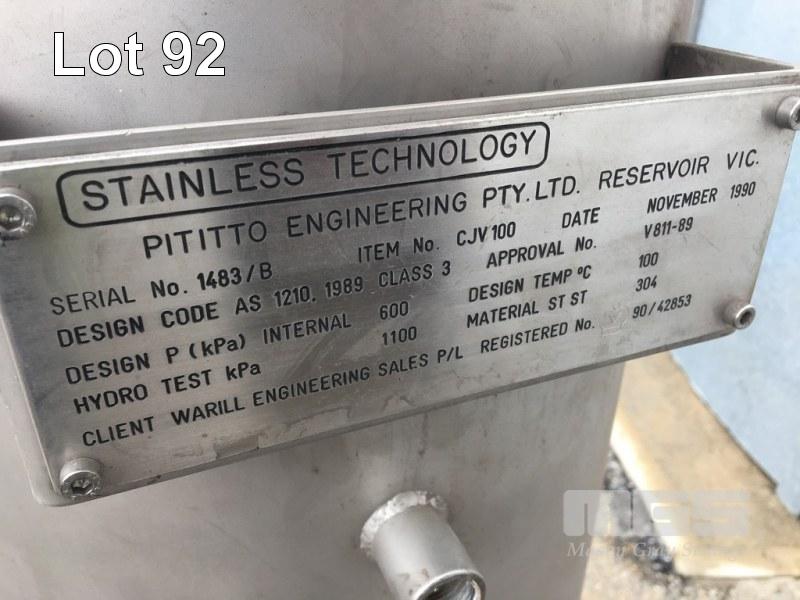 STAINLESS STEEL AIR RECEIVER, PITITTO ENGINEERING, AUST WORKING PRESSURE 600KPA