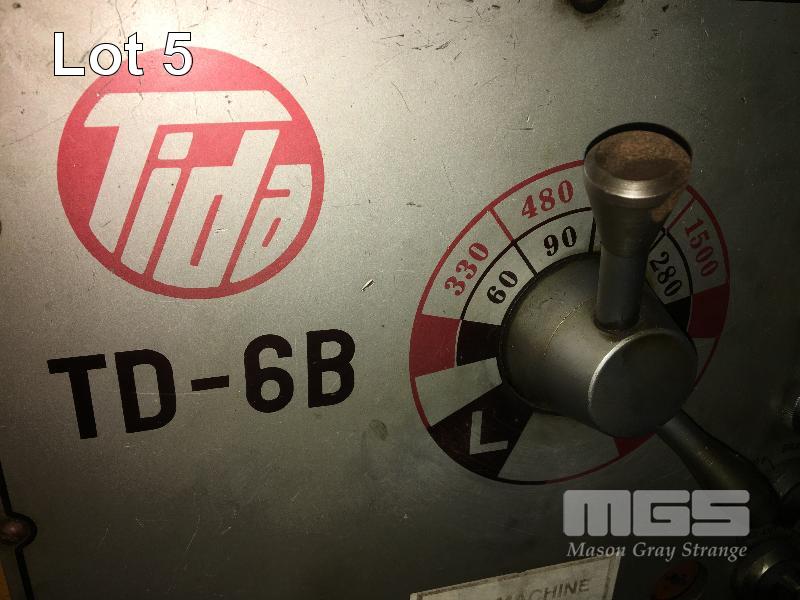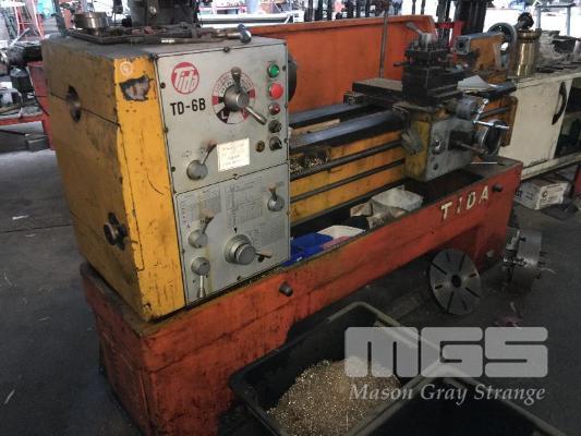 LATHE, TIDA MOD: TD-6B BED LENGTH: 1066mm (BETWEEN CENTRES) SWING OVER BED: 355mm SWING OVER CROSS SLIDE: 230mm SWING OVER GAP: 600mm SPINDLE BORE DIAMTER: 52mm 415V WITH 3 & 4 CAM LOC JAW CHUCKS 2 x STEADIES & FACE PLATE