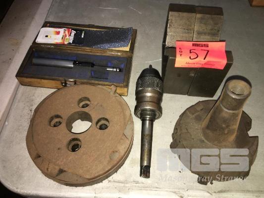 2 x CAST IRON VEE BLOCKS, 2 x FACE CUTTERS, KEYLESS 16mm CHUCK & ARBOR No2