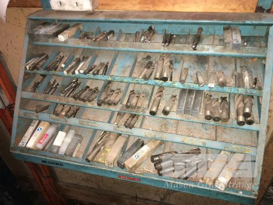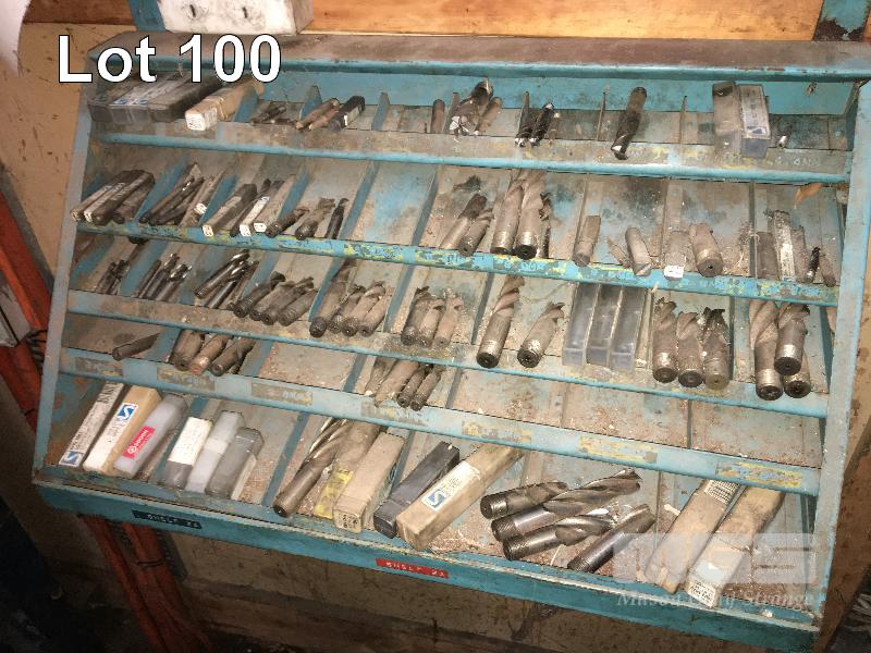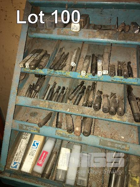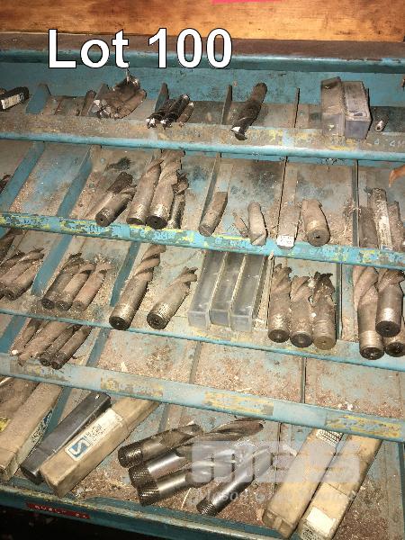 END MILLS, SLOT DRIVES, METRIC & IMPERIAL, APPROX 100 PIECES, WITH RACK CONTENTS OF RACK