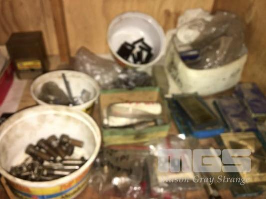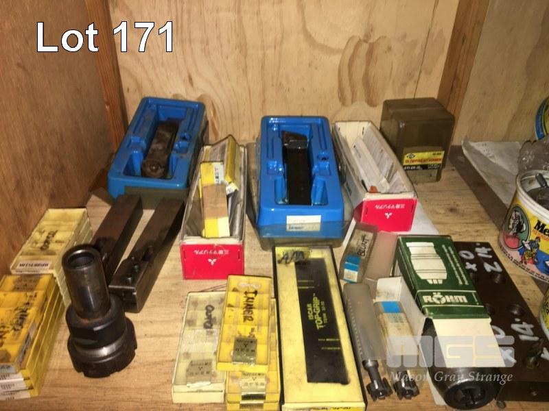 LATHE TOOLS INCLUDING CHUCKS, COLLETS, SLOT DRILLS, CUTTERS, CARBIDE TIP CUTTERS & TIPS, ASSORTED SIZES INCLUDING 25 x 25mm 1 x SHELF