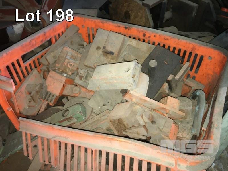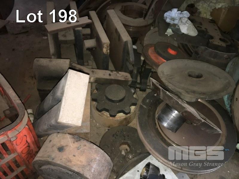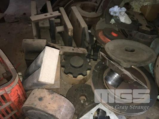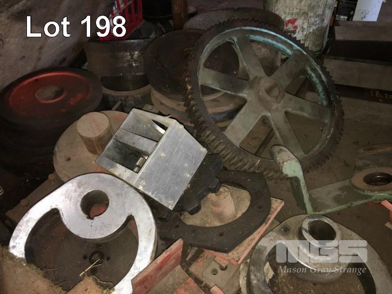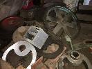 QUANTITY STEEL GEARS, COGS, SPROCKETS, PULLIES, MACHINE COMPONENTS, PRESS DIES, ETC UNDER STEEL RACK (NOT TIMBER BOX OF NYLON)