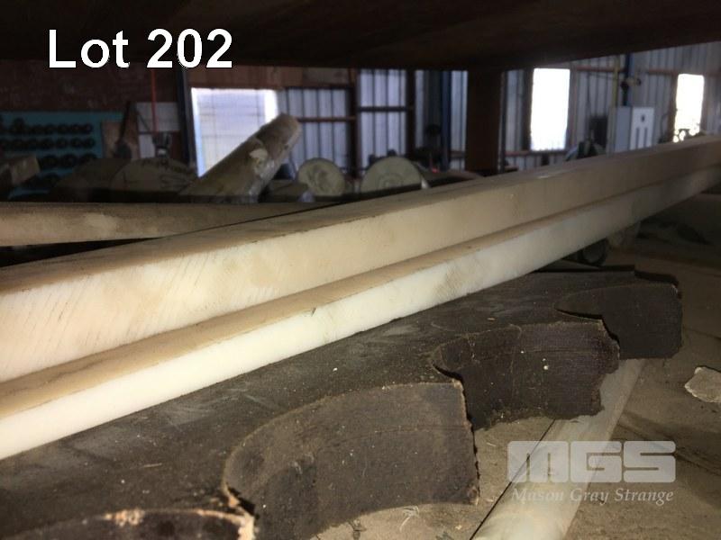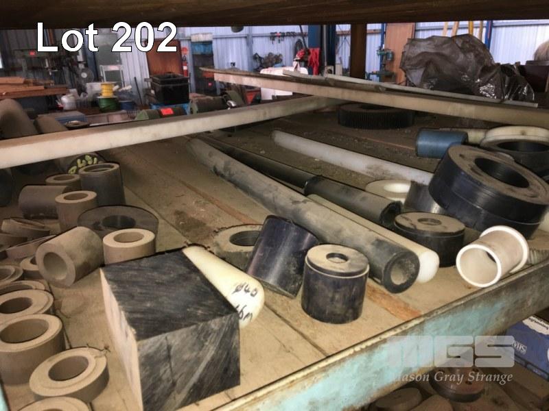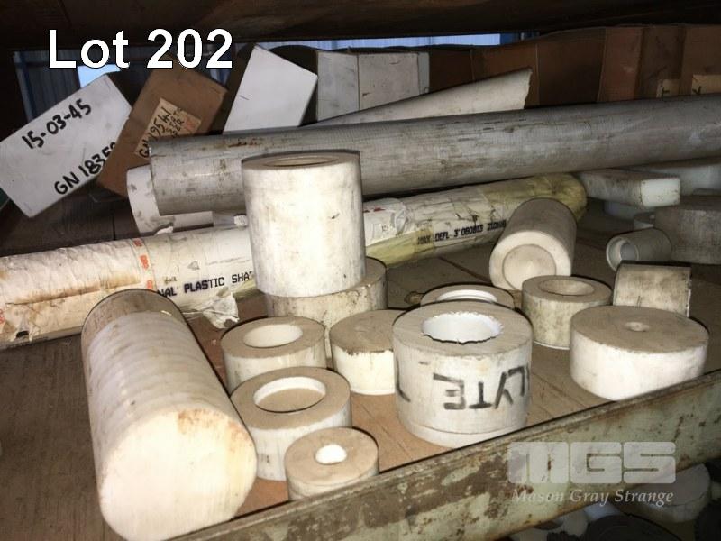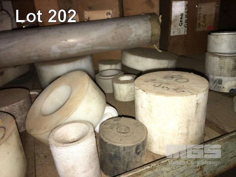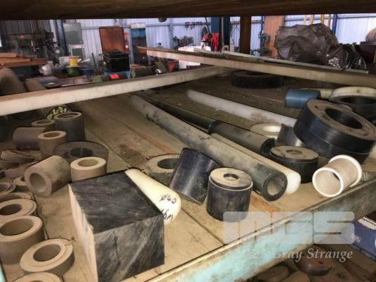 ASSORTED TEFLON & NYLON, SOLID & HOLLOW, ROUND BAR & OFFCUTS, PAINT, GEARS, ETC, INCLUDING TIMBER BOX ON GROUND CONTENTS 1 x SHELF