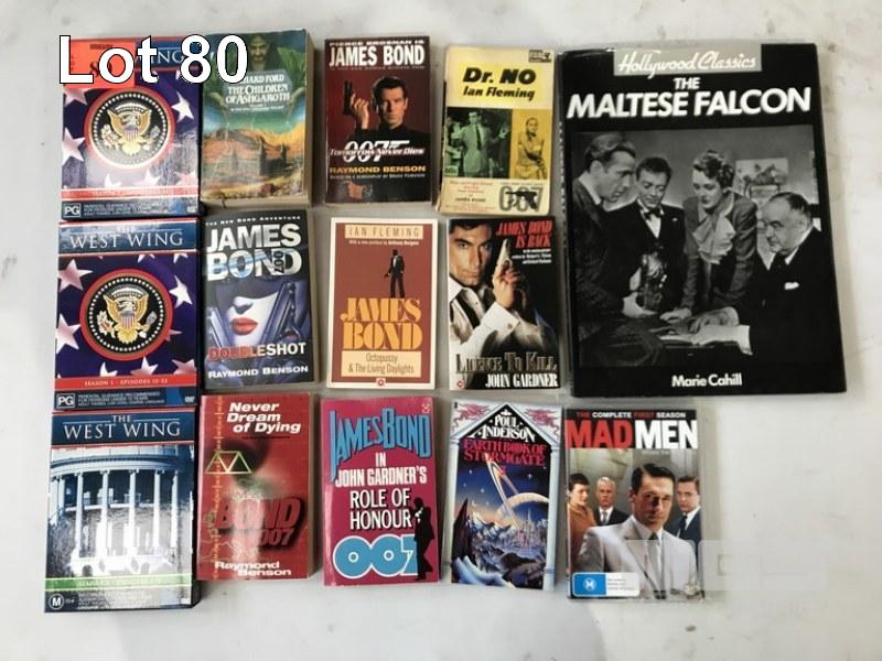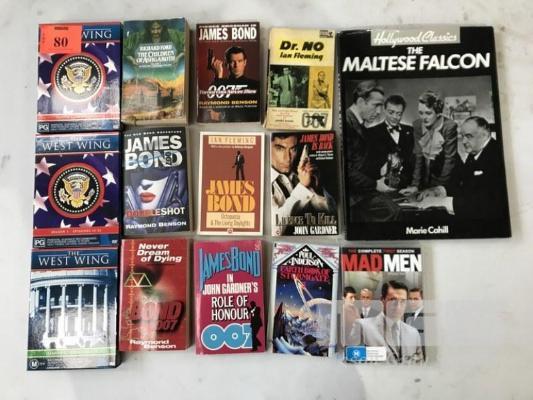 3 x WEST WING DVDS, 11 x VARIOUS BOOKS, JAMES BOND, DR. NO, EARTH BOOK OF STORM GATE, THE MALTESE FALCON, MADMEN