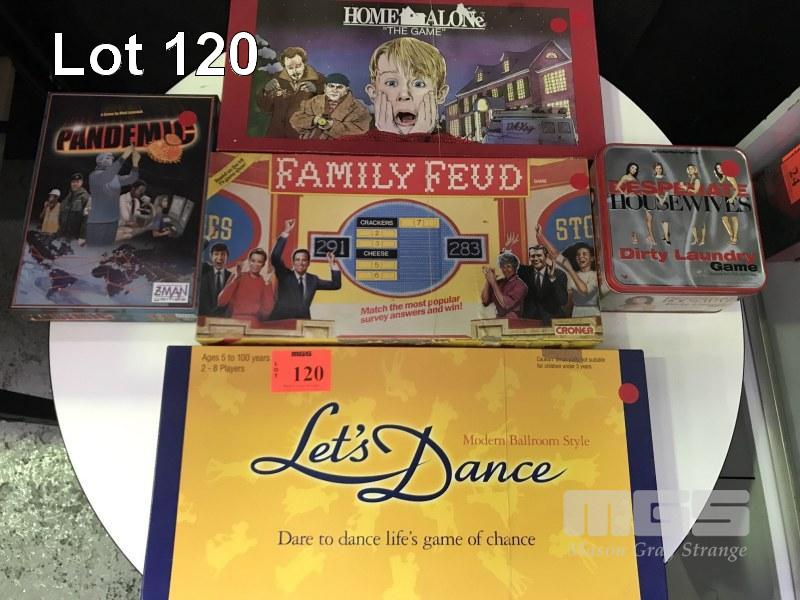 5 x BOARD GAMES, FAMILY FEUD, HOME ALONE, PANDEMIC, DESPARATE HOUSEWIVES, LETS DANCE