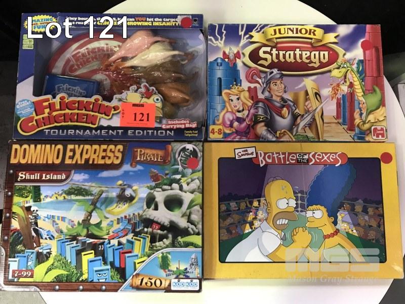 4 x BOARD GAMES, FLICKIN CHICKEN, JUNIOR STRATEGO, DOMINO EXPRESS, BATTLE OF THE SEXES