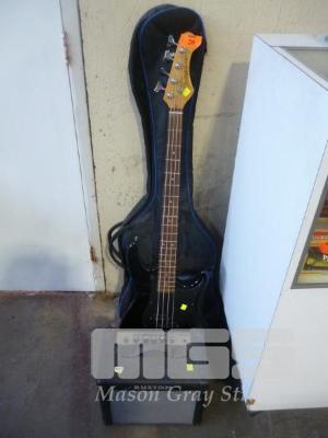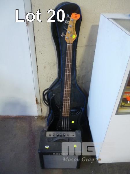 SAMICK BASS GUITAR, KUSTOM PORTABLE AMP WITH ASHTON SOFT CARRY BAG & LEADS.