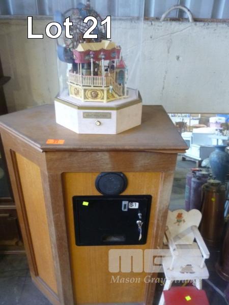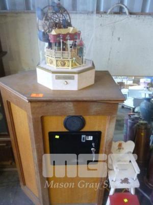 ENESCO SMALL WORLD OF MUSIC AUTOMATED CARNIVAL DISPLAY BEHIND PERSPEX, MOUNTED TO TIMBER CABINET, COIN OPERATED AND CHILDREN'S DOLL HIGH CHAIR
