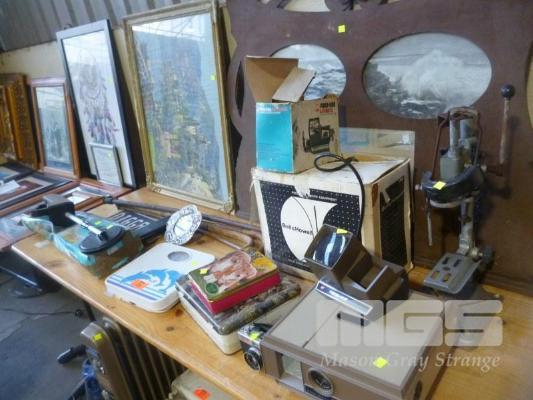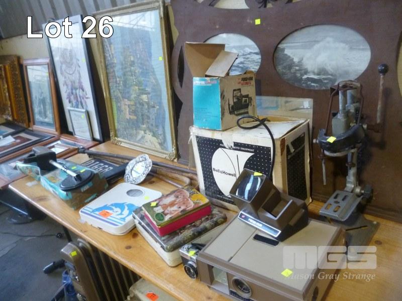 METAL DETECTOR, RICOH CAMERA, BELL & HOWELL PROJECTOR, DRILL STAND, ETC