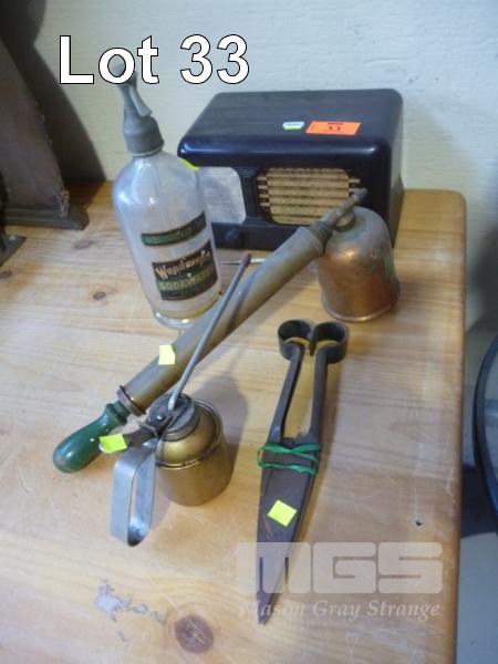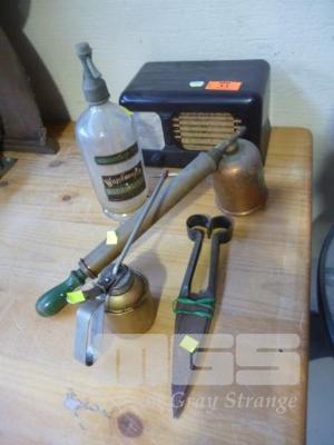VINTAGE PETER PAN BAKELITE RADIO, WOODROOFE SODA SIPHON, SHEARS, OILER, BRASS SPRAYER