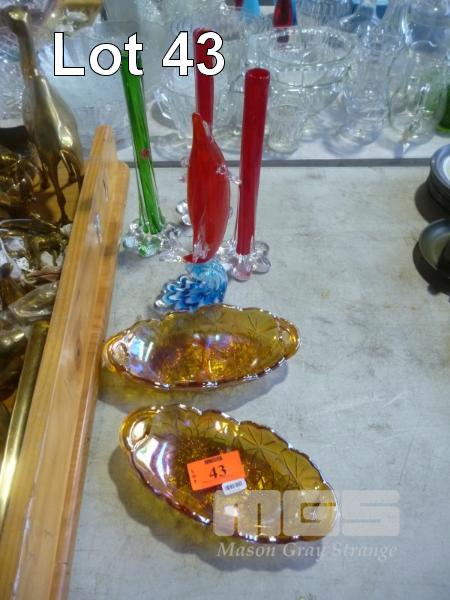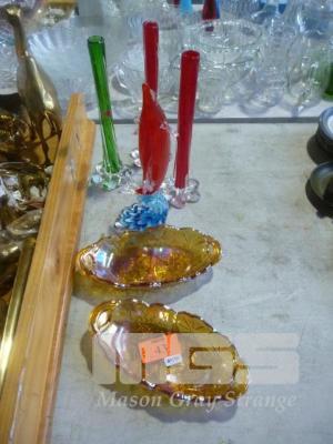 2 x CARNIVAL GLASS DISHES, 3 x VASES & ART GLASS SWORD FISH