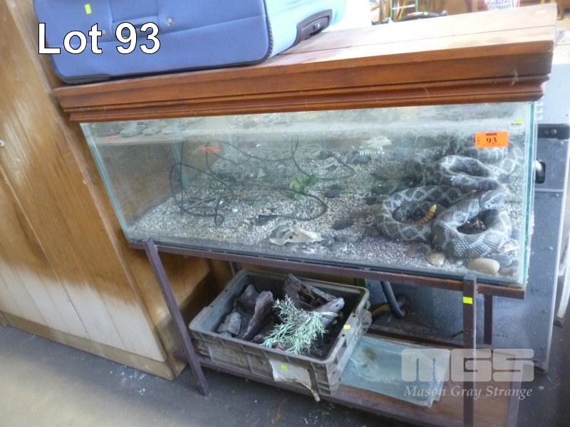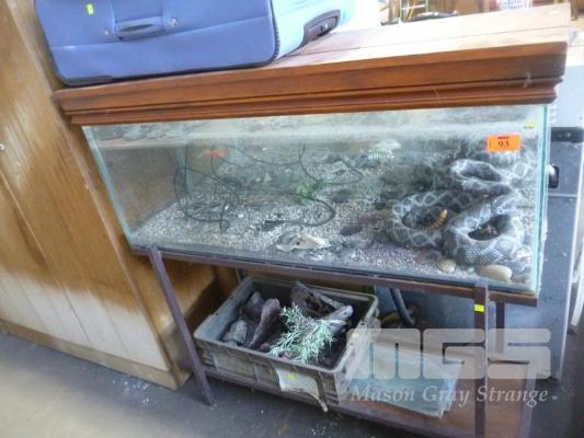 VIVARIUM/AQUARIUM, 4' WITH MIRROR BACK, STAND, LIDDED PINE TOP, SNAKE ORNAMENT, HIDES & A SUITCASE