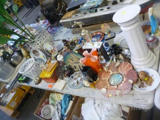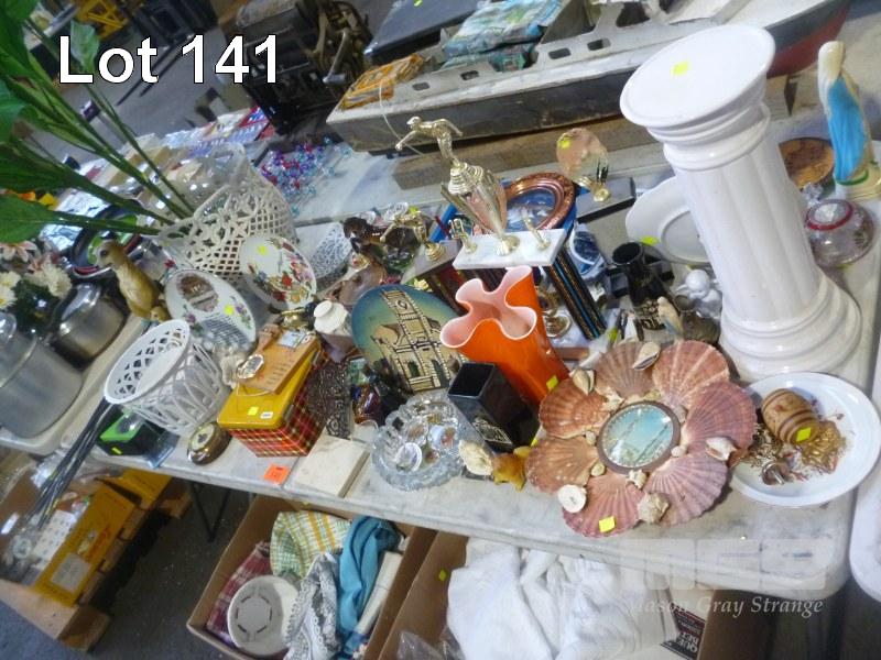 ASSORTED TRINKETS, TROPHIES & CAST ALLOY POT STAND, 1 x TABLE