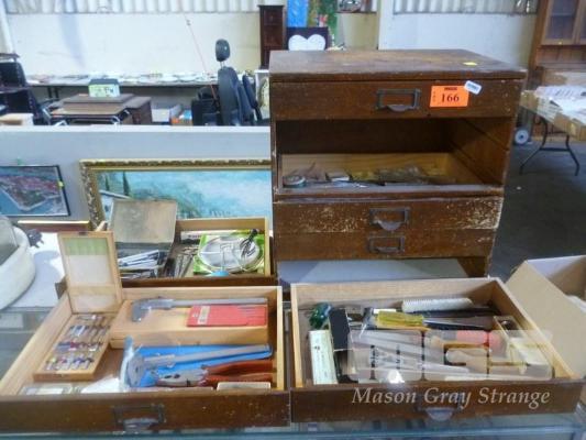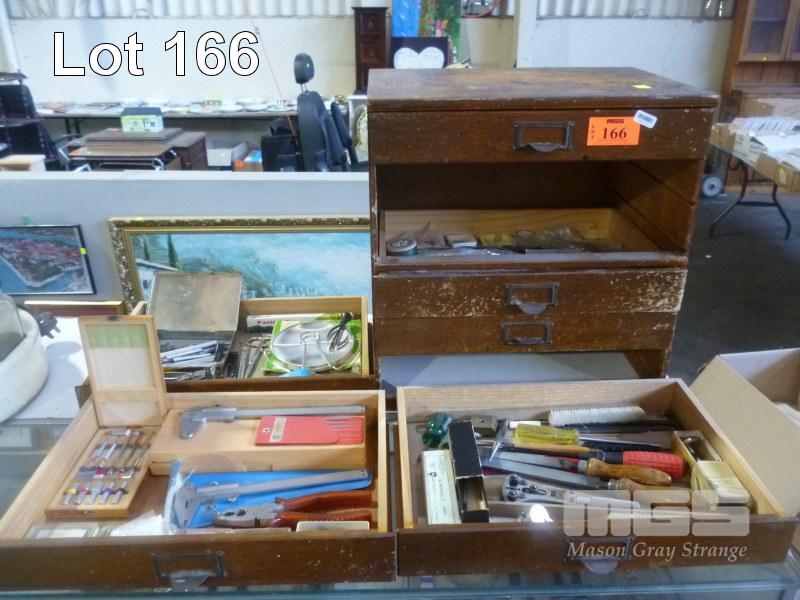 6 DRAWER, TIMBER, WATCH MAKERS DRAWERS, SCREWDRIVERS, PLIERS & VINTAGE CLOCK KEYS