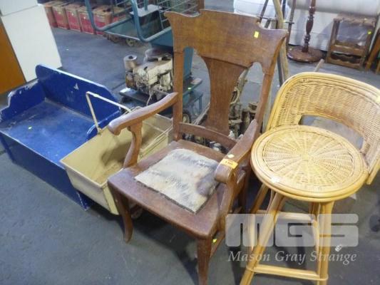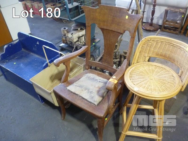 CANE STOOL TIMBER ARM CHAIR, CHILDRENS TOY PRAM & SEATED TOY BOX