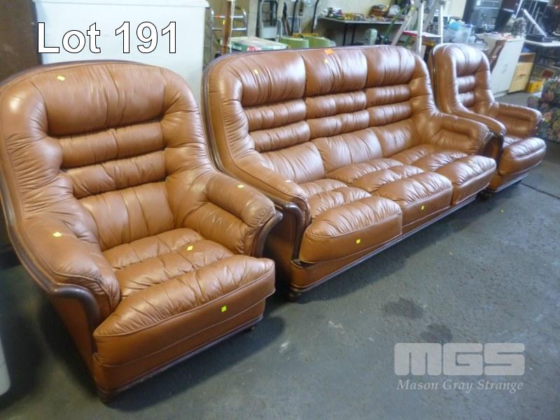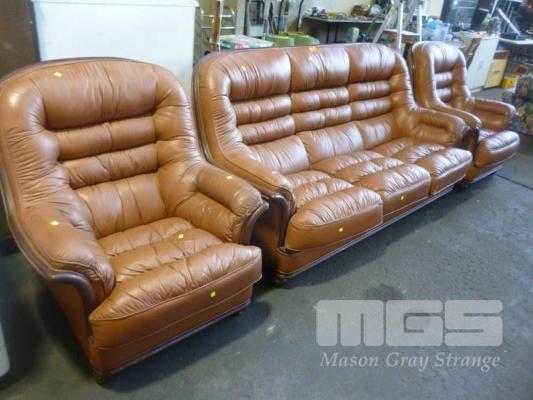 3 SEATER LEATHER LOUNGE WITH TIMBER ACCENTS & 2 x SINGLE ARM CHAIRS