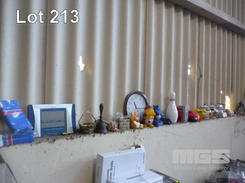 ASSORTED HOMEWARES INCLUDING CAST IRON BELL, LILLIPUT LANE HOUSE, MONEY BOX COLLECTION, ETC - 1 SHELF.