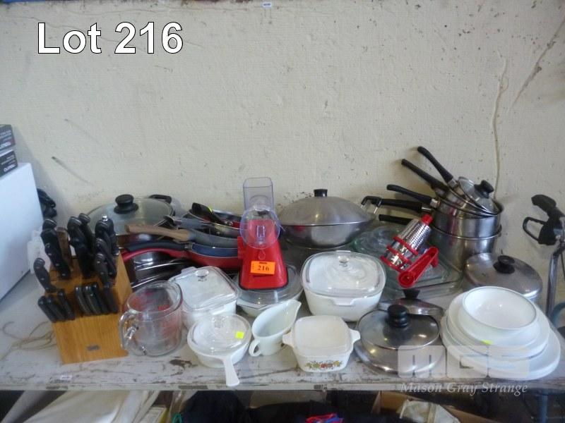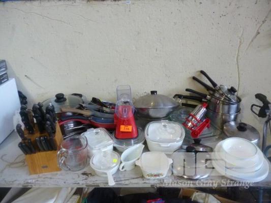 ASSORTED COOKWARE, FRY PANS, KNIFE BLOCK, ETC, 1/2 TABLE