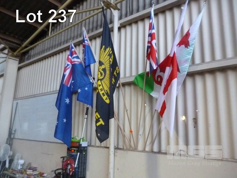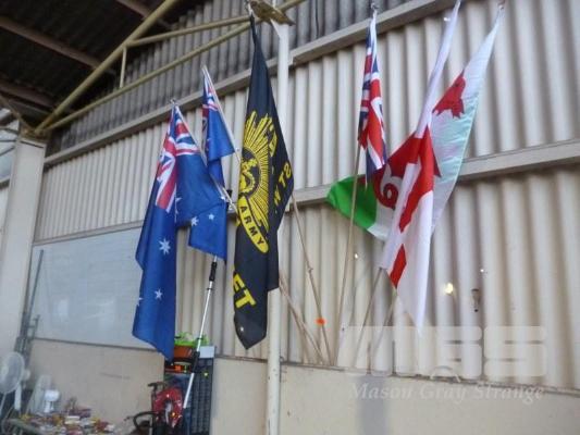 ASSORTED FLAGS & FLAG POLES INCLUDING AUSTRALIAN AMERICAN & REMEMBRANCE - 15 APPROX ON POLES & ON TABLE.