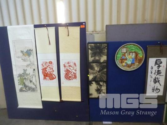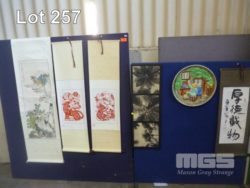 4 x ASIAN THEMED SCROLLS, DISPLAY PLATE, ETC